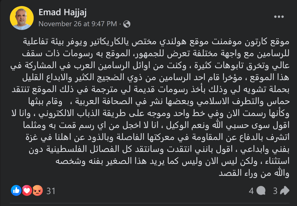 بصراحة هذا الخطاب طال عن حدّه، ولا يمكن الحديث مع شخص يستهبل، لكنّني سأقفز عن أغلب الكلام الذي لديّ وأذكّرك أنّك فيما يخصّ رسم تبادل الأسرى (عموما نحن نسمّي من لدى حماس من الصهاينة بالمحتجزين، ونسمّي من لديهم بأسرى أو مختطفين من قبل الاحتلال) كتبت أوّل منشور لديك على فيسبوك مدّعيًا أنّ الرسم قديم، وسارعت بشطبه لأنّه منشور بتاريخ واضح! وقلت إنّك ستنتقد أيّ فصيل فلسطيني، أمّا في هذه المادّة فأنت تقرّ بسياق الرسم، فنفهم أنّك تركت الاستهبال، لكن للأسف أنت لم تتركه!
