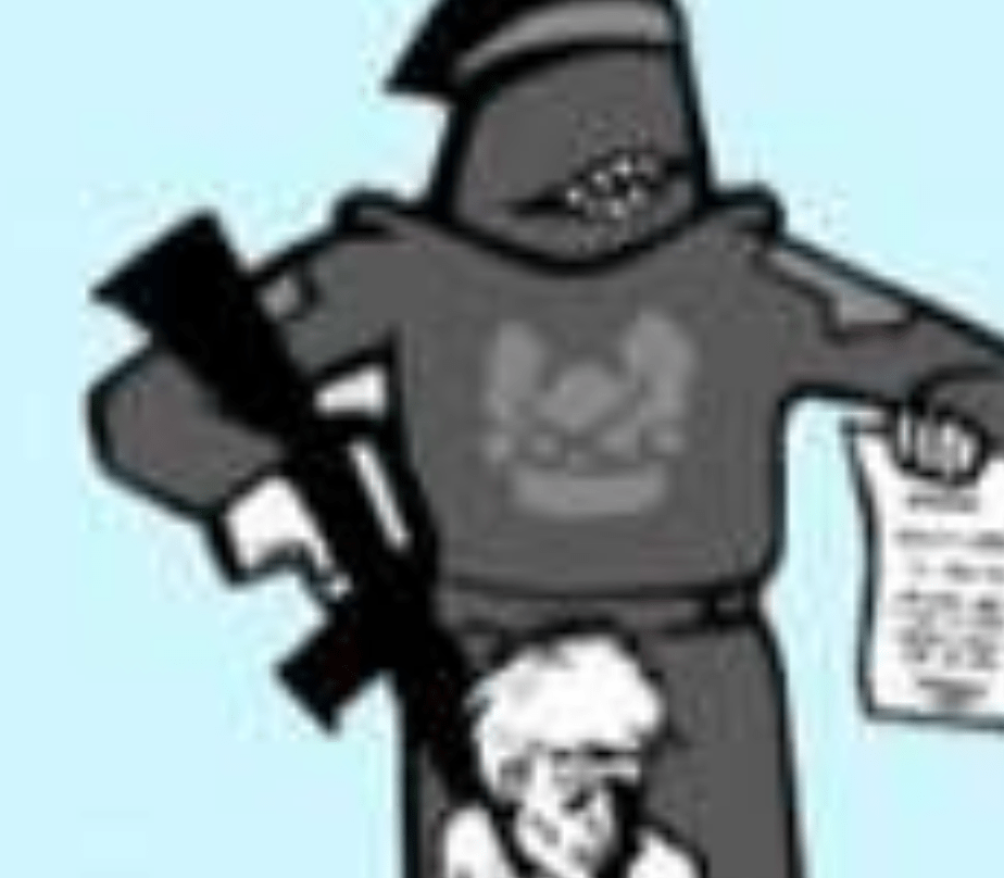 الآن نعود للاستهبال مرّة أخرى! الرسم الذي تسمّيه “إرهابيّ يتقنّع بعلم إسرائيل” ليس كما تصفه، فهذا الرجل الظاهر في الرسم، هو نتيجة الخراب والحصار والسلاح، وهو مقنّع بعلم الكيان الذي يبدو بسبب الدماء كوفيّة حمراء، والرجل يرفع سبّابته، وهي صورة أيقونيّة شهيرة لا داعي لشرحها، فليس عند أي طفل شكّ أنّك تقصد هنا أن كتائب القسّام وناطقها الرسميّ مساوية للكيان.