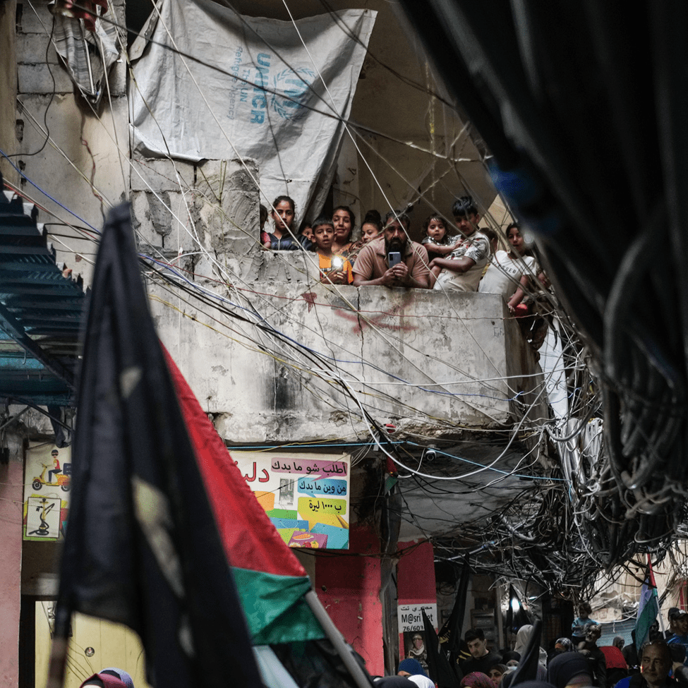 سكان يشاهدون مظاهرة لحركة مقاومة فلسطينية في مخيم شاتيلا للاجئين الفلسطينيين في بيروت، 11 مايو 2024. حسن عمار | أسوشيتد برس