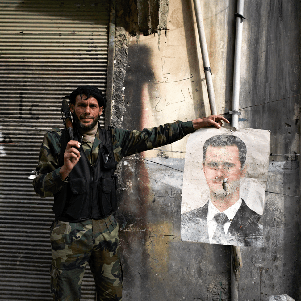 مقاتل من الجيش السوري الحر يحمل ملصقاً ممزقاً بالرصاص للرئيس الأسد في حلب، سوريا، 30 مارس 2013. سيباستيانو تومادا | سيبا